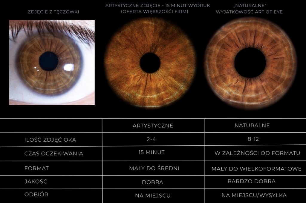 Art of Eye to jedyne miejsce w Polsce, gdzie oferujemy nie tylko artystyczne, jak większość firm, ale również naturalne zdjęcie tęczówek. Zdjęcie artystyczne z licznymi efektami do wyboru będzie gotowe w 15 minut. Zdjęcie „naturalne” wymaga więcej pracy, precyzji dlatego tego samego albo w kolejnych dniach. Oferujemy wysyłkę na całą Polskę i Europę.